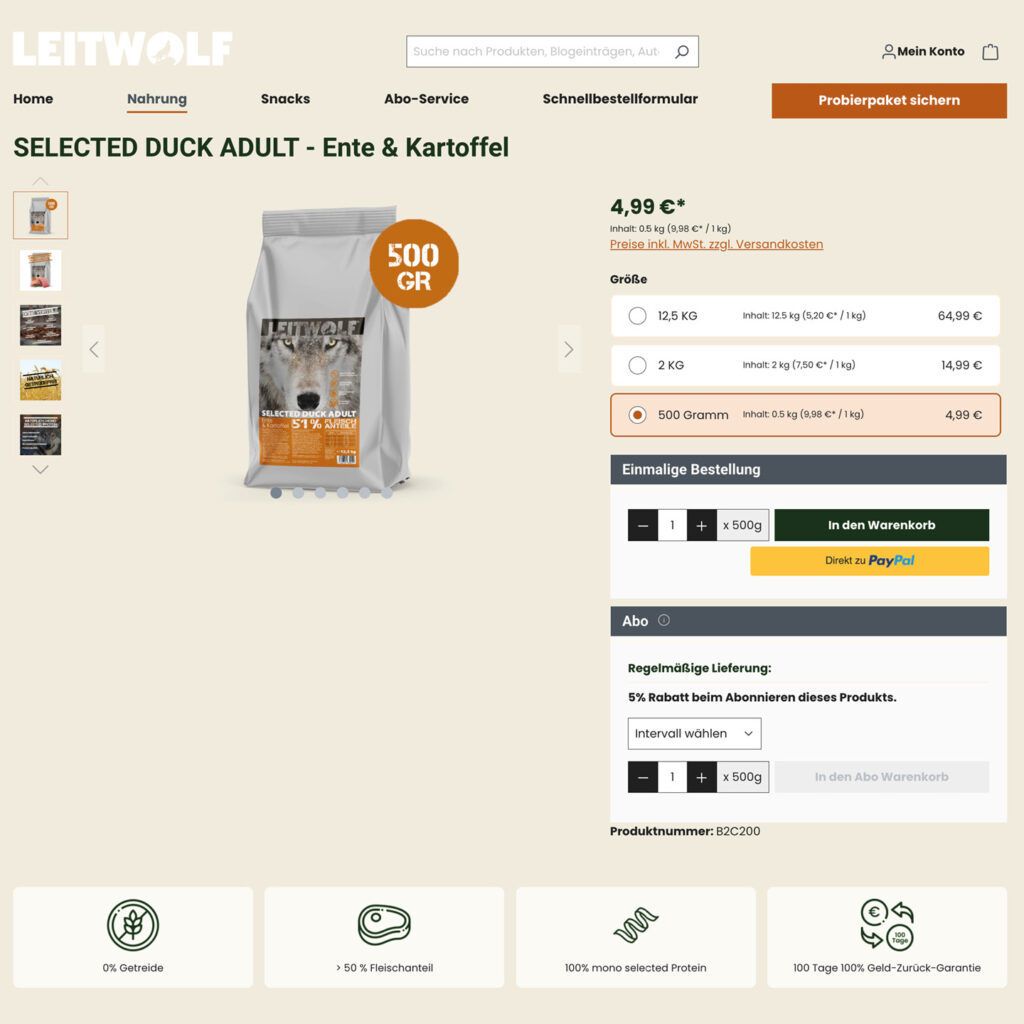 Der neu gestaltete Leitwolf Shop ist ein Beweis für die erfolgreiche Verbindung von ästhetischem Design und praktischer Funktionalität. Das neue Erscheinungsbild ist nicht nur modern und ansprechend, sondern auch vollständig an die überarbeitete Storyseite angepasst. Die hinzugefügten Funktionen wie das Abo-System und das Schnellbestellformular bieten den Kunden erheblichen Mehrwert und tragen zu einem verbesserten Einkaufserlebnis bei.